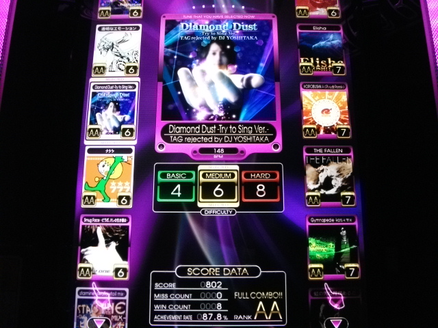 そんな中ふとプレイしてみたらクリア出来た曲。全体的に跳ねリズムの同時押しが特徴。中盤の左右振り地帯は今でも苦手。でも曲のリズムにノるとゲージMAX維持出来るので最後がちょっとラス殺しっぽくても耐えられた!!
