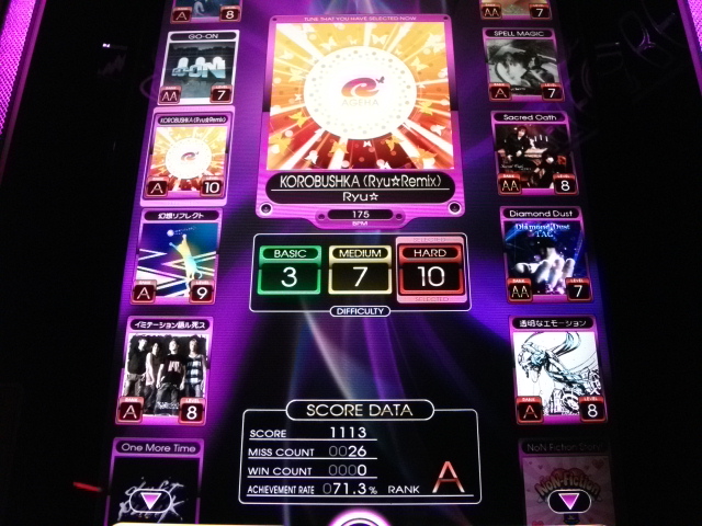 太陽の城」でHYPER譜面を武器に何度もプレイしたからタイミングはだいたい覚えていて後は前半・後半にある三重上下押し地帯ですが、そこはもぅガムシャラに三つ同時押しを上下に動かして切り抜け最後はそのままゴール!